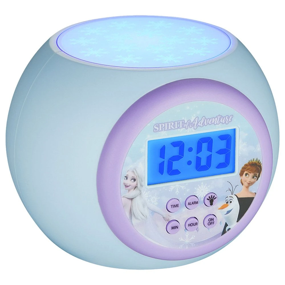 Disney’s Frozen Anna and Elsa projector and alarm clock with blue backlight LCD screen. Nightlight with a projection of snowflowers on the ceiling in 3 colors. With automatic timer of 5,10,30 minutes to turn off. Alarm with snooze function, wake up with Anna and Elsa.