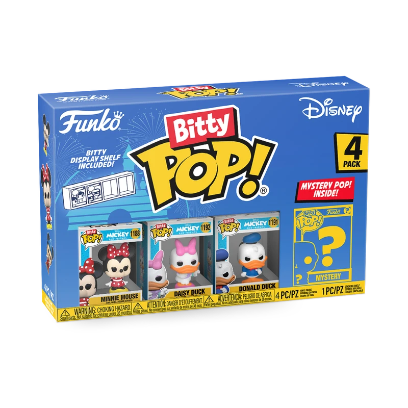 Your favorite Pops! have been shrunk into Bitty Pops! Expand your Disney collection with this assortment of Bitty Pop! figures featuring your most beloved cartoon characters! This 4-pack includes Bitty Pop! Minnie Mouse (red dress), Bitty Pop! Daisy Duck, Bitty Pop! Donald Duck, and a mystery Bitty Pop! figure. The possible mystery Bitty Pops! are Hyper Rare (1/6) Steamboat Willie, Hyper Rare (1/6) Band Concert Mickey, Rare (1/3) Conductor Mickey, and Rare (1/3) Brave Little Tailor.