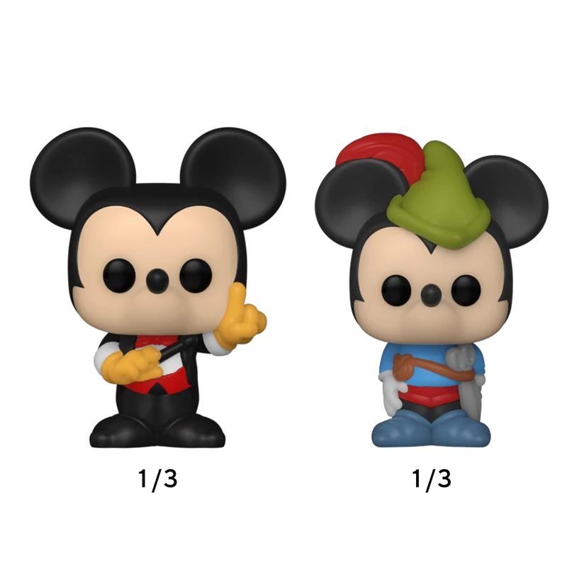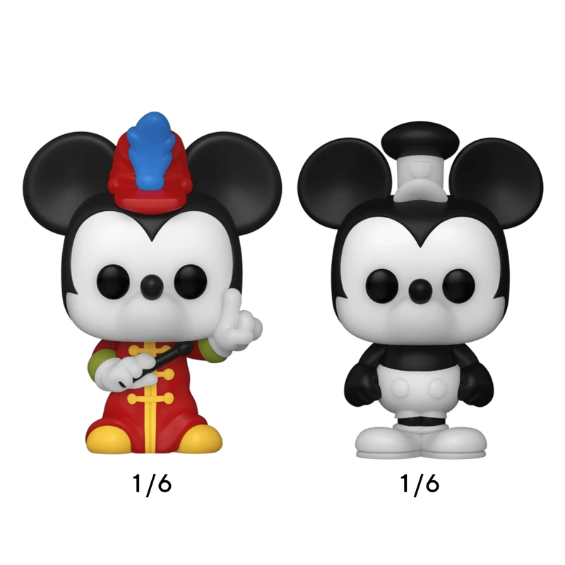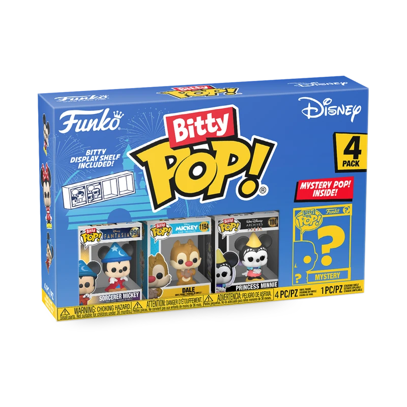 Your favorite Pops! have been shrunk into Bitty Pops! Expand your Disney collection with this assortment of Bitty Pop! figures featuring your most beloved cartoon characters! This 4-pack includes Bitty Pop! Sorcerer Mickey, Bitty Pop! Dale, Bitty Pop! Princess Minnie, and a mystery Bitty Pop! figure. The possible mystery Bitty Pops! are Hyper Rare (1/6) Steamboat Willie, Hyper Rare (1/6) Band Concert Mickey, Rare (1/3) Conductor Mickey, and Rare (1/3) Brave Little Tailor.