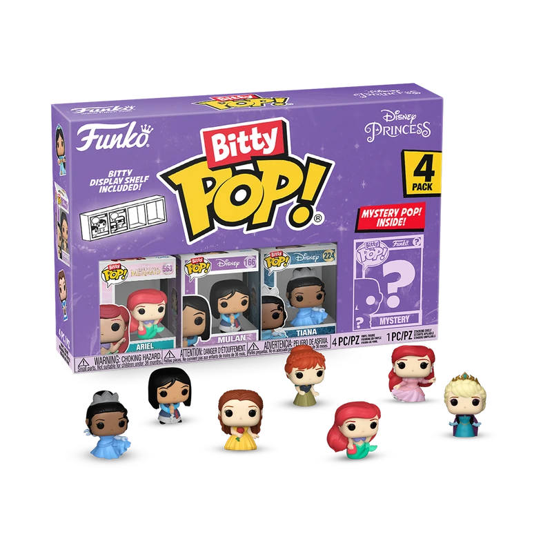 Your favorite Disney Princess Pops! have been transformed into Bitty Pops! Expand your collection with this assortment of Bitty Pop! figures featuring your most beloved, royal heroines as miniaturized figures! This 4-pack includes Bitty Pop! Ariel, Bitty Pop! Mulan, Bitty Pop! Tiana, and a mystery Bitty Pop! figure. The possible mystery Bitty Pops! are Hyper Rare (1/6) Belle (yellow dress), Hyper Rare (1/6) Coronation Elsa, Rare (1/3) Ariel (pink dress), and Rare (1/3) Coronation Anna.