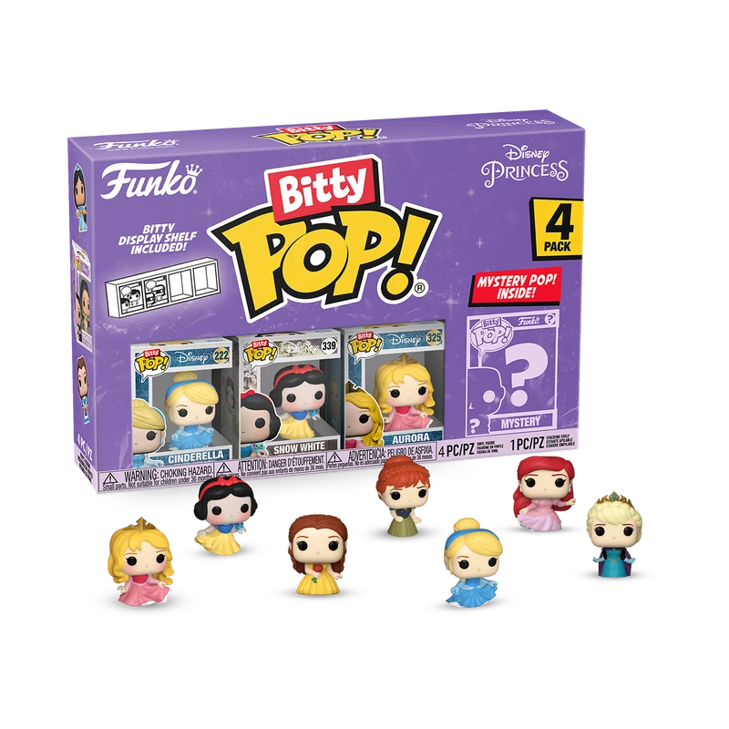 Your favorite Disney Princess Pops! have been transformed into Bitty Pops! Expand your collection with this assortment of Bitty Pop! figures featuring your most beloved, royal heroines as miniaturized figures! This 4-pack includes Bitty Pop! Cinderella, Bitty Pop! Snow White, Bitty Pop! Aurora, and a mystery Bitty Pop! figure. The possible mystery Bitty Pops! are Hyper Rare (1/6) Belle (yellow dress), Hyper Rare (1/6) Coronation Elsa, Rare (1/3) Ariel (pink dress), and Rare (1/3) Coronation Anna.