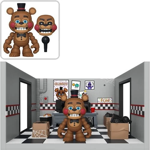 Five Nights at Freddy : Close in on SNAPS! Freddy in his Storage Room Playset before he moves! The Storage Room Playset with Freddy comes with 13 customizable pieces, including 2 face pieces, 1 torso, 1 pair of legs, 1 head, 1 accessory, 6 play pieces, and 1 playset base. The play pieces include 3 storage boxes, 2 smashed television sets, and a waste basket, which can all be moved to customize each playset. Play pieces can be snapped to the table and face pieces can be snapped to the wall! In fact, you can collect and connect playsets to create even more scary fun adventures.