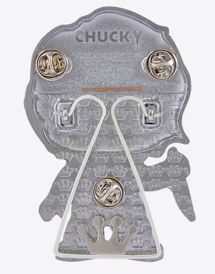 Schedule a playdate with Chucky as a Pop! Pin. Pop! Pin Chucky makes a killer accessory for any outfit. Capture him to haunt your wardrobe. Pin features 3D molded details, shiny silver metal-colored hardware, the signature Loungefly/Funko crown debossing on the back, and a built-in stand. Enamel-fill pin is approximately 4-inches tall.