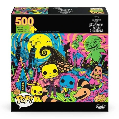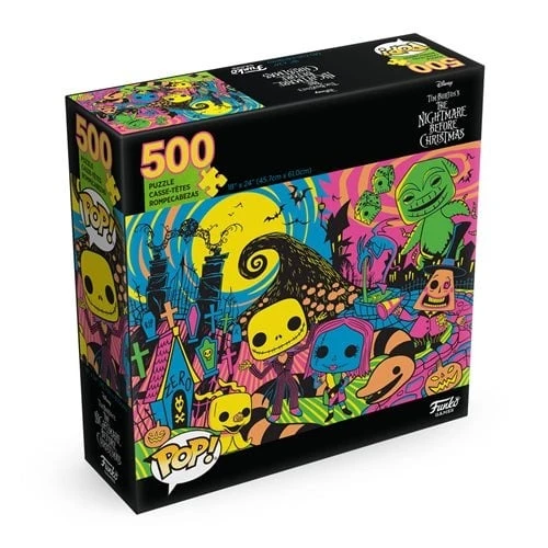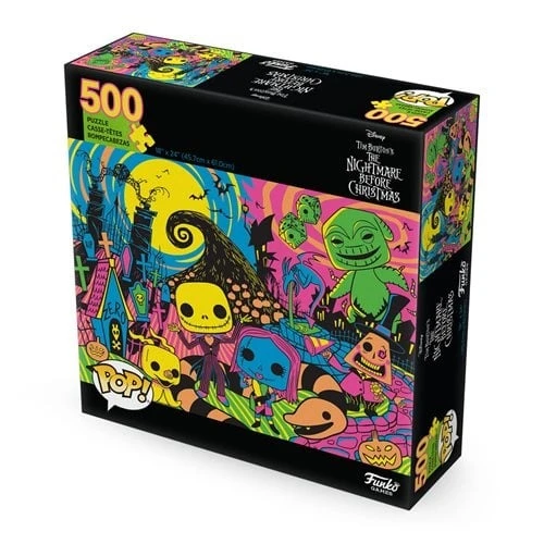 Put your skills to the test with this entertaining The Nightmare Before Christmas Blacklight 500-Piece Pop! Puzzle! A fun challenge that makes for an amazing display piece once completed. The completed puzzle measures approximately 18-inches tall x 24-inches wide. A perfect puzzle for the whole family, featuring an original illustration inspired by Tim Burton’s animated Disney film, The Nightmare Before Christmas! Comes packaged in a colored box and measures approximately 7 9/10-inches tall x 7 9/10-inches wide.