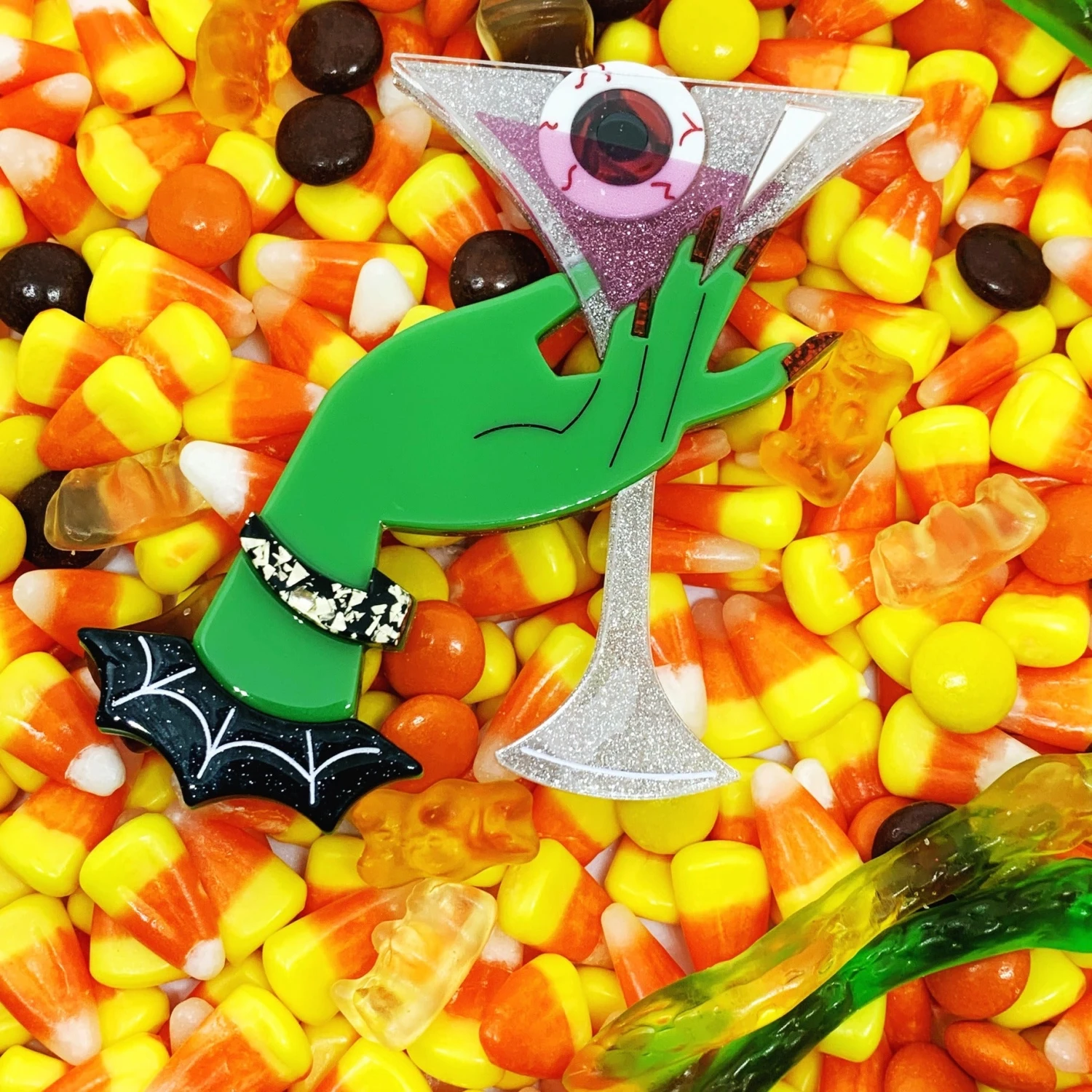 Eye’ll Have Another features a sparkly cocktail with eyeball garnish… obviously! 3.5″ tall – this one is a Halloween statement piece.