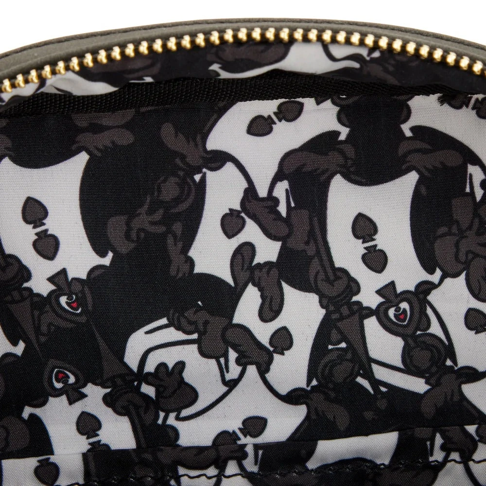 The Loungefly Disney Alice in Wonderland Ace of Spades Crossbody Bag is made of vegan leather (polyurethane). Bag has adjustable shoulder strap (detachable), sturdy metal hardware, appliques, debossed, and printed details. Take note of the coordinating pattern of the inside lining fabric.