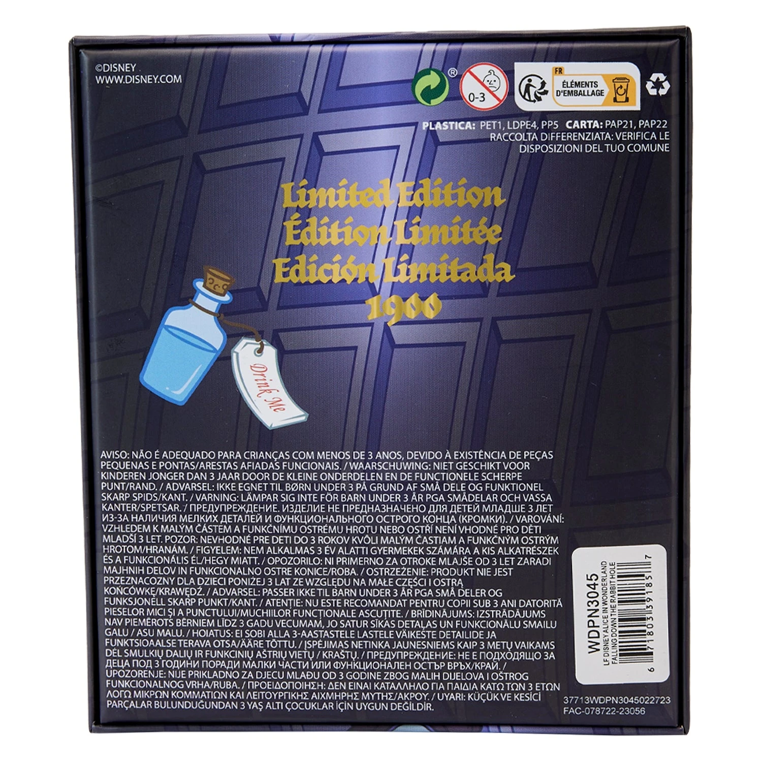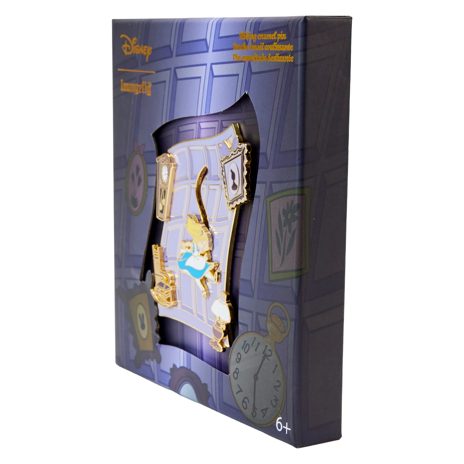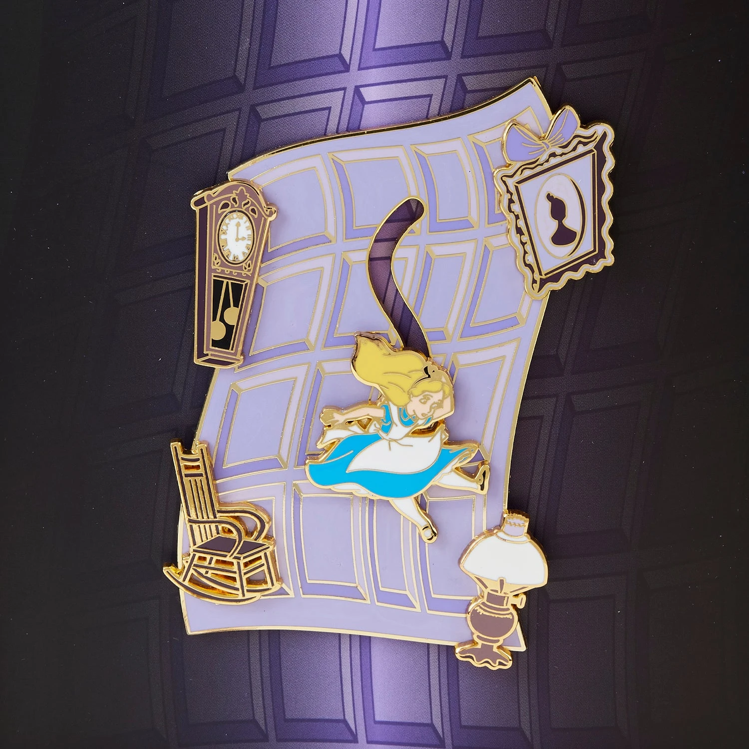 Curiosity, piqued! Turn your pin collection upside down with our Loungefly Disney Alice in Wonderland Falling Down the Rabbit Hole 3-Inch Collector Box Pin. The wavy interior of the rabbit hole comes into view in figural form. Alice falls past a clock, a rocking chair, a portrait, and a lamp. A sliding mechanism on the back allows Alice to travel in a curvy pattern down or back up. Falling for this collector box pin is easy—and it’s a great way to show off your fandom while keeping a favorite animated moment close.