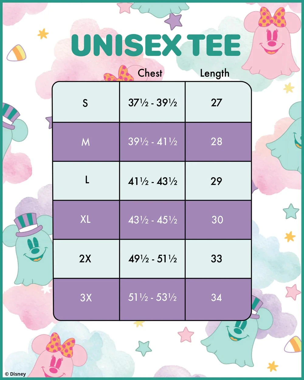 Slip into the spirit of the season with this boo-tiful Loungefly Disney Mickey and Minnie Mouse Pastel Ghost Unisex Tee. The all-over-print, in flowing pastels, features Mickey Mouse dressed as a ghost—and his ghoul-friend, Minnie Mouse. Together, they float in a motif of candy-corn pieces, clouds, and stars. Different colored rings, around the neck and sleeves, add pastel accents in purple, pink, and green. It’s the perfect tee-shirt for scaring up some fun—or for relaxing with a cup of hot apple cider after playing in the leaves.