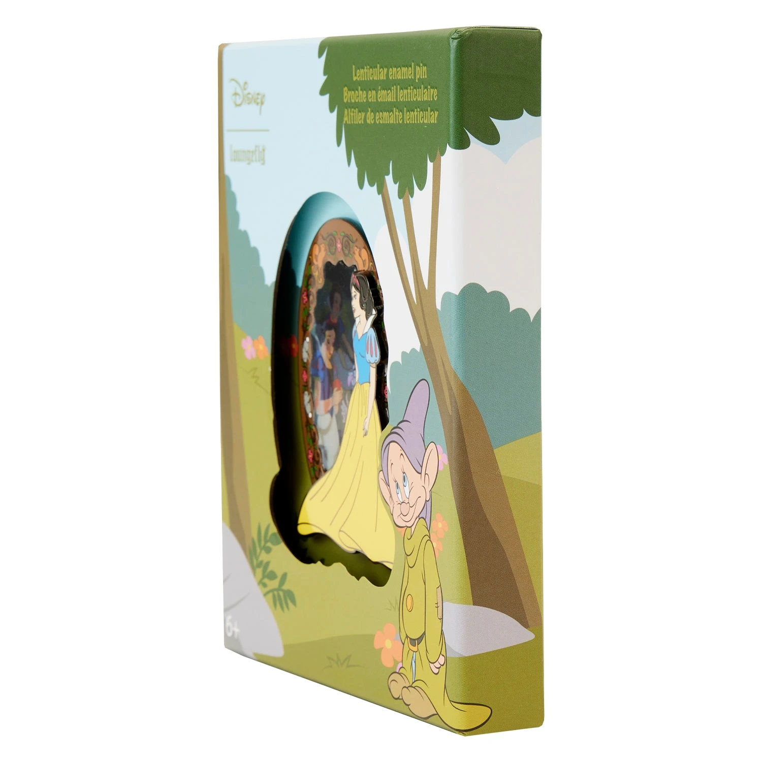 Take a spin around the dance floor and crown your pin collection the fairest of them all! Our Loungefly Disney Snow White Lenticular Scene 3-Inch Collector Box Pin is a real gem. This layered, enamel pin has Snow White in the foreground, her yellow dress softly billowing. As she looks into the window frame, which is embellished with decorations and woodland creatures, she sees her Prince helping her down from her horse in the forest. Lenticular details reveal an alternate view of the Evil Queen, disguised, and offering an apple. This pin will quickly become the apple of your eye.