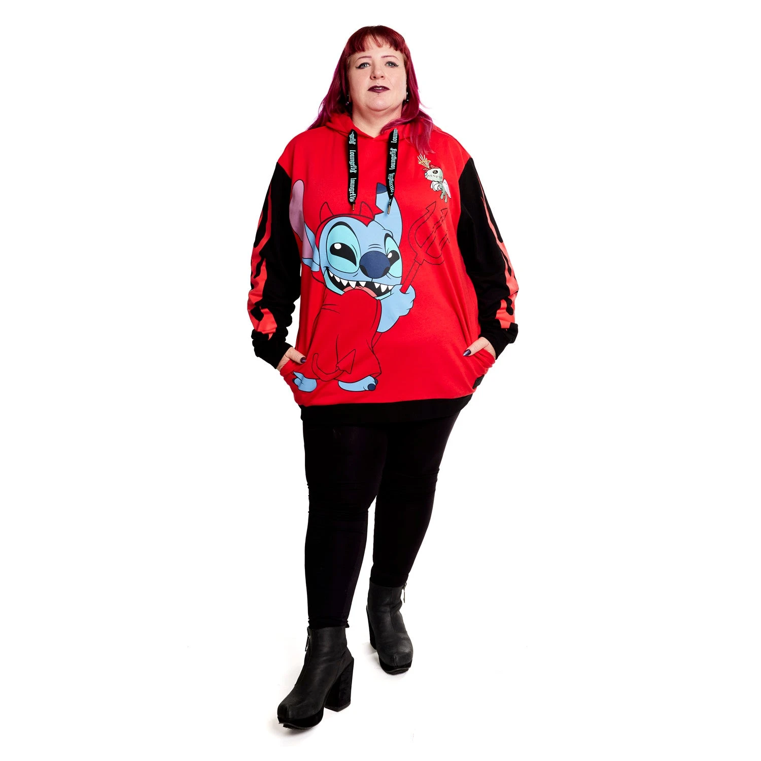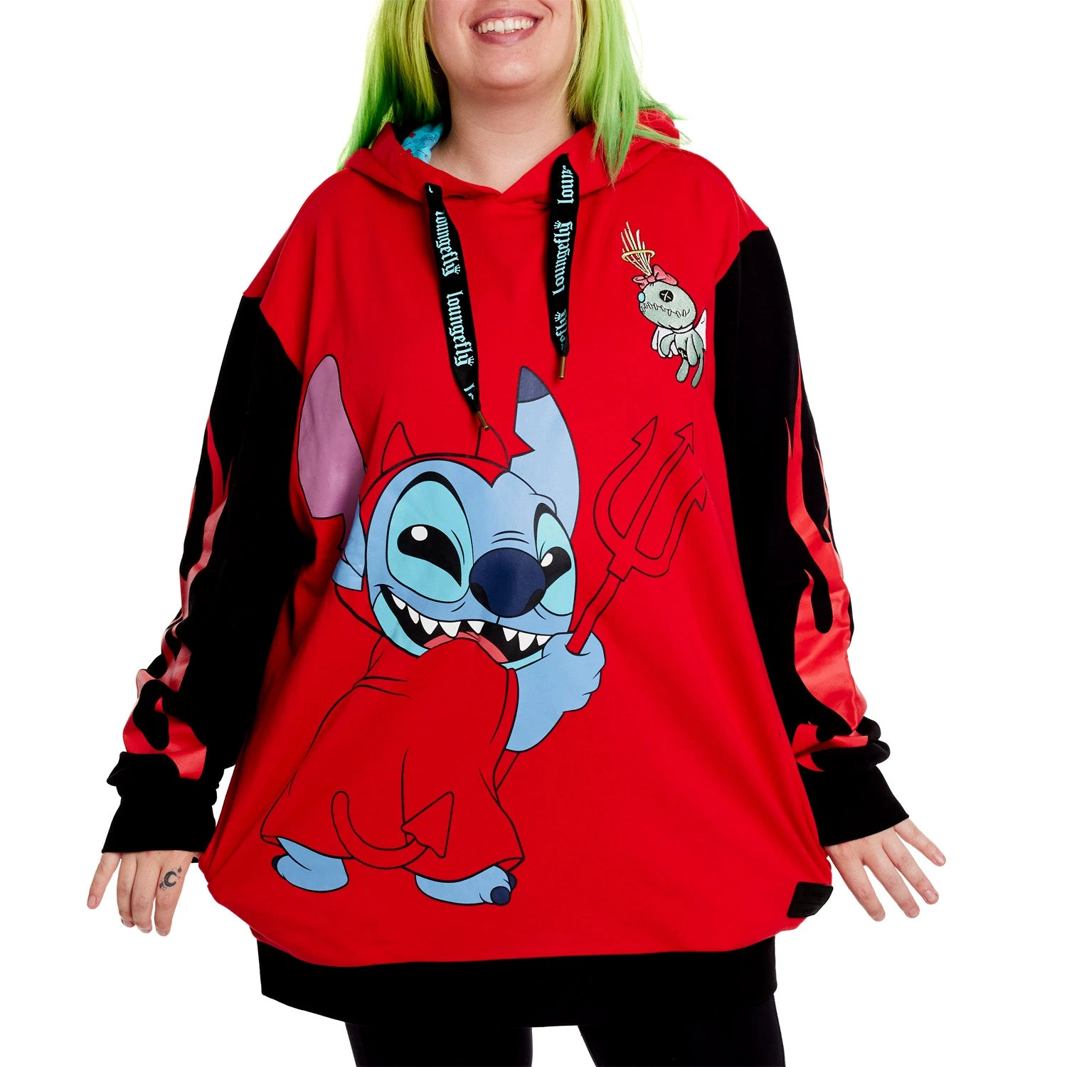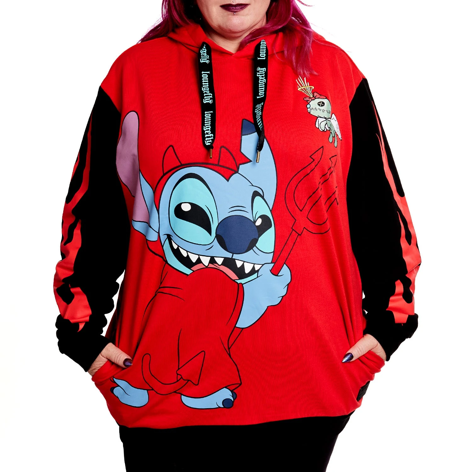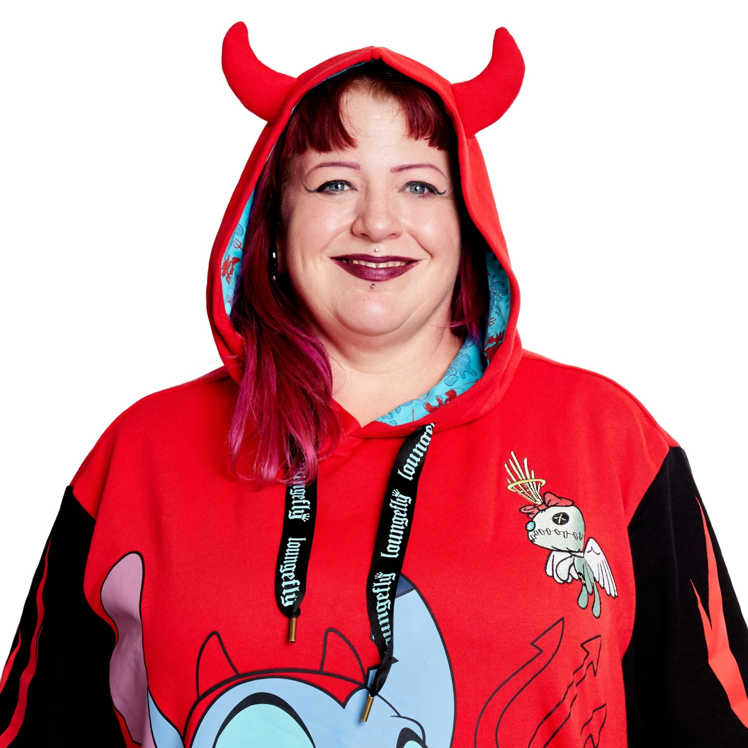 The Loungefly Disney Stitch Devil Hoodie is made of French terry fabric (60% cotton, 40% polyester). Additional features include an extra-large, lanyard-style drawcord and a lined hood.