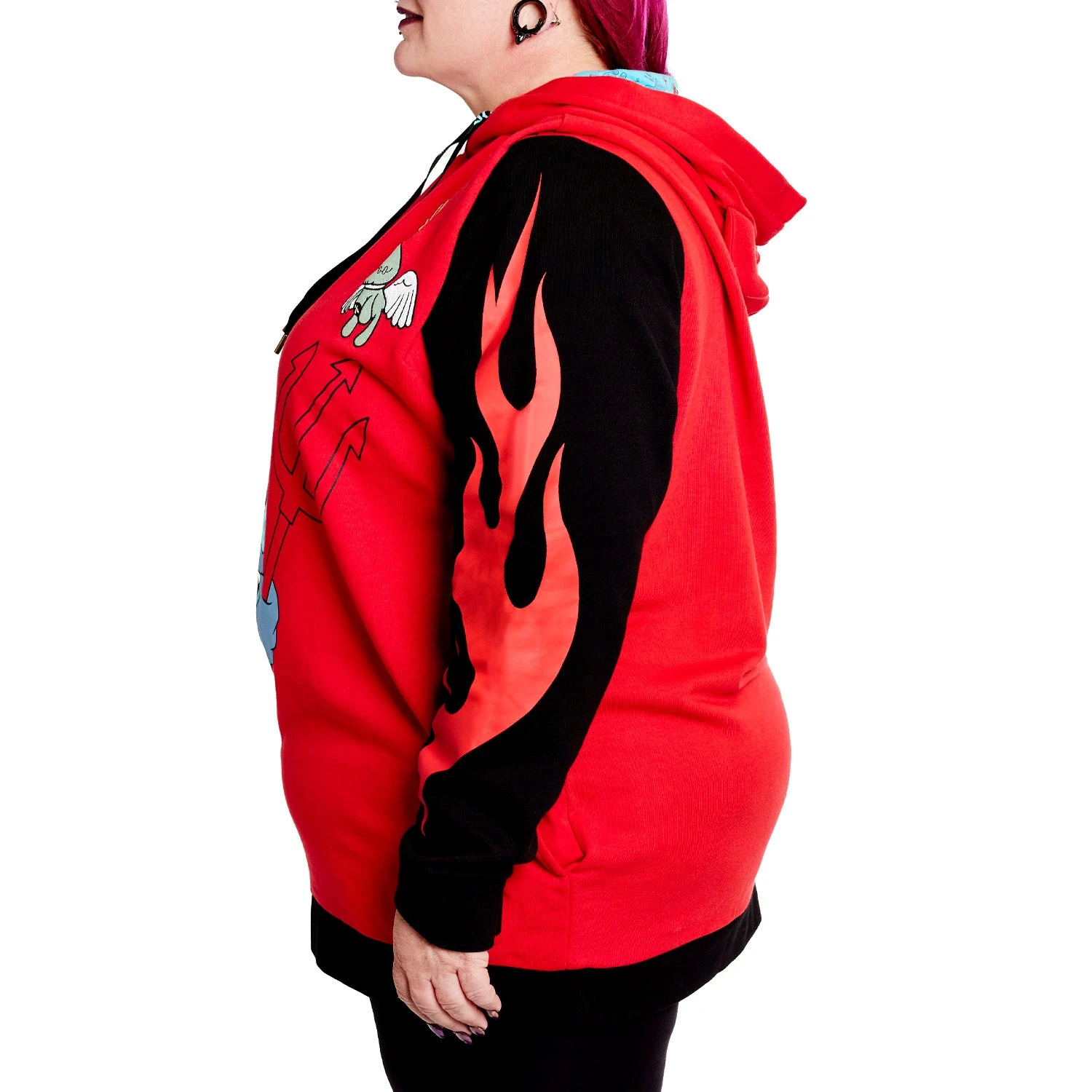 We’re all fired up about this hoodie! Have a devilishly delightful time wherever you go with our Loungefly Disney Stitch Devil Hoodie. Stitch is the “devil in disguise,” with his pitchfork in hand, looking mischievously over his shoulder. Above him, Scrump appears, in embroidered detail, as an angel. A pair of padded horns, right on the hood, top off the look and red flames shoot up over the sleeves of this red and black color-block jersey with side pockets. Turn everyday outings into out-of-this-world adventures.