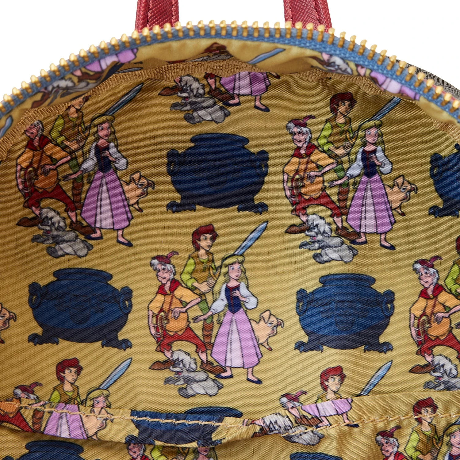 Stir the pot! Our Loungefly Disney The Black Cauldron Mini Backpack is brimming with details. On the front of this backpack, the Horned King wields his power over the cauldron, while an army of the “Cauldron-Born” rises up in eerie shadowed silhouettes behind him. On the front zipped pocket, Creeper confronts Taran, who brandishes his sword as he protects Hen Wen, Eilonwy, Gurgi, and Fflewddur Fflam. An enamel zipper charm of the sword finishes off the look in visionary style. On the back, the Black Cauldron makes an encore appearance. Make a frightfully fashionable entrance, wherever your travels may take you.