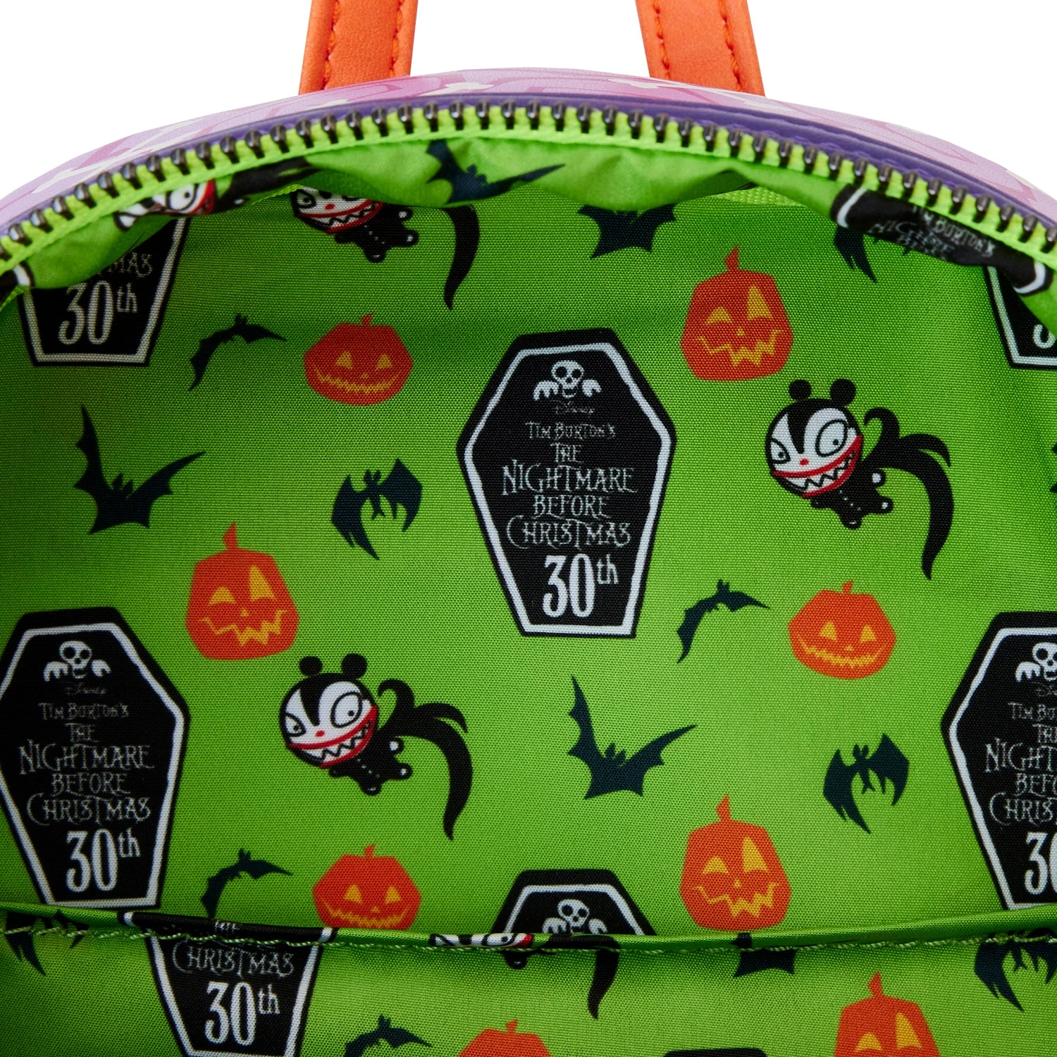 The Loungefly Nightmare Before Christmas Scary Teddy Present Mini Backpack is made of vegan leather (polyurethane). Bag has adjustable shoulder straps and gunmetal-colored hardware. Additional features include applique, embroidered, glow-in-the-dark, and printed details. Take note of the coordinating inside lining.
