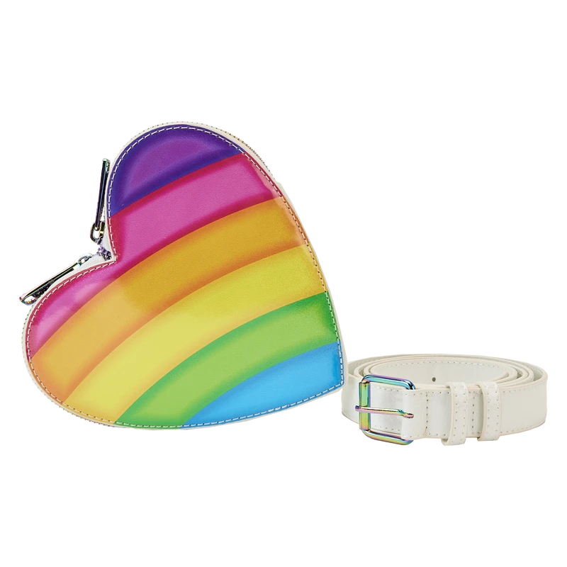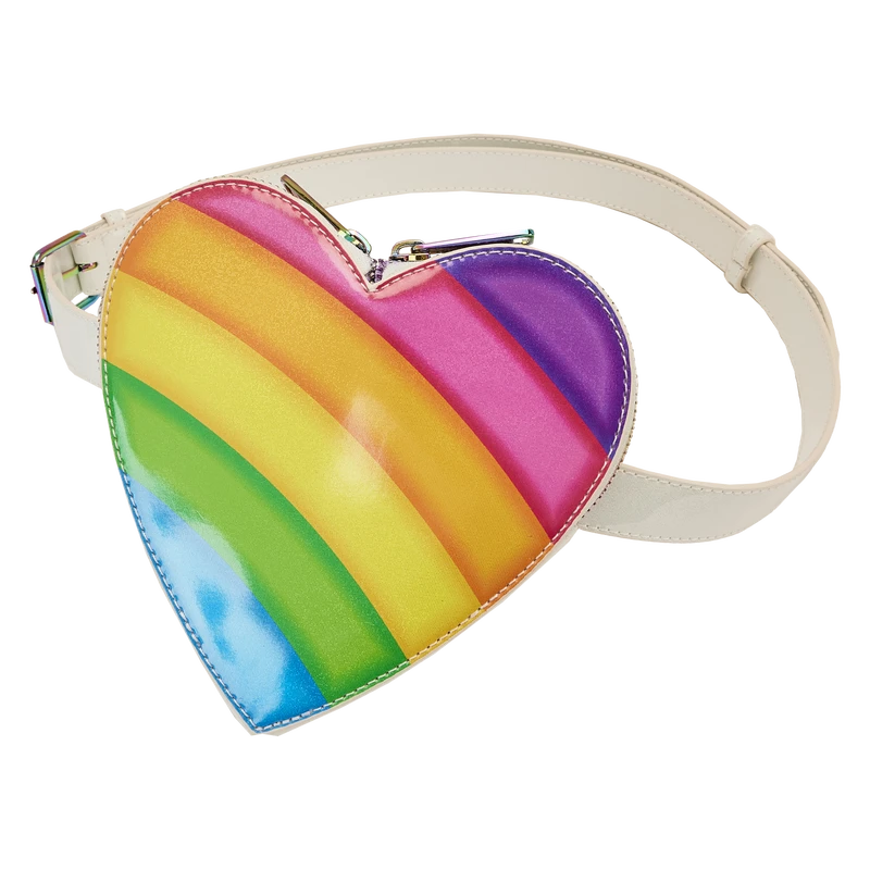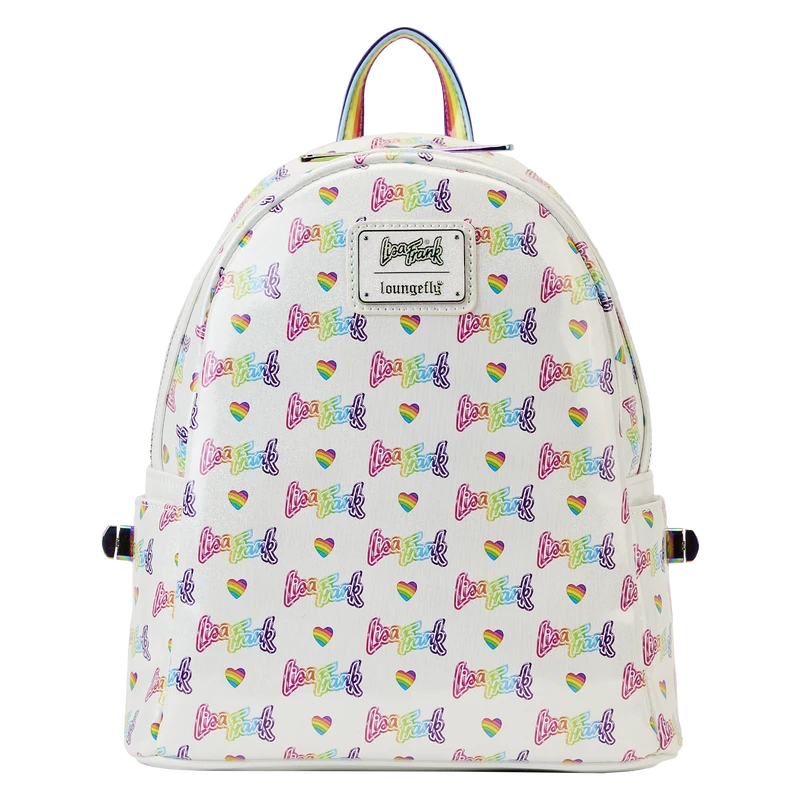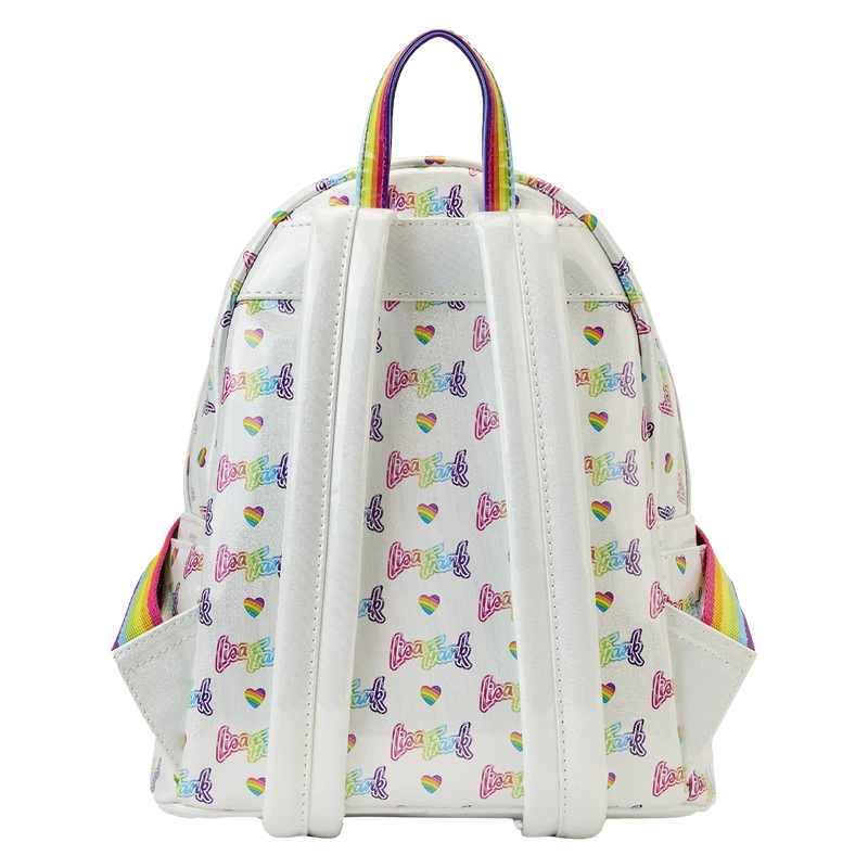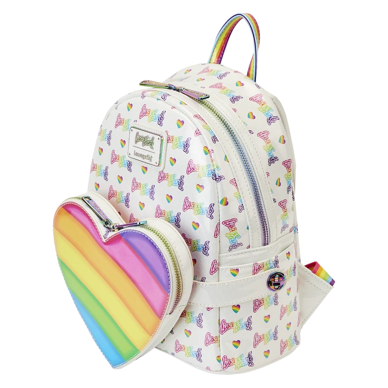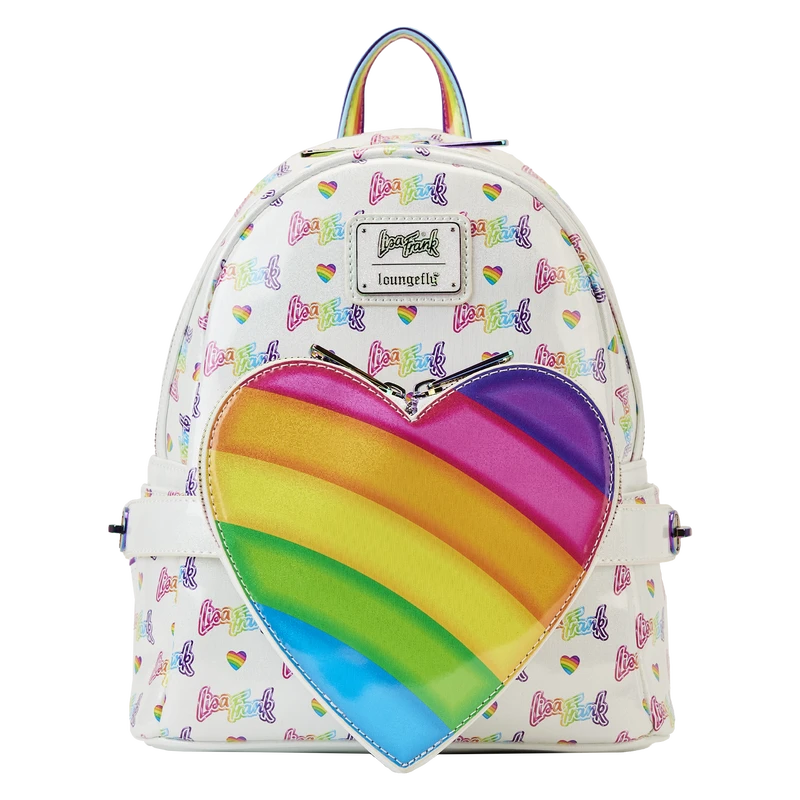 Take off with flying colors! Bring cheerful splashes of bright rainbow hues wherever you go with our Loungefly Lisa Frank Rainbow Heart Mini Backpack. This backpack, which features Lisa Frank’s unmistakable style, includes a detachable heart-shaped waist bag that shimmers in rainbow details. The waist bag has two straps, one of which attaches to the backpack, and the other that will be placed inside when shipped. A metal turn lock on both side pockets allows you to attach the waist bag to the backpack. An all-over-print of the Lisa Frank logo and rainbow hearts, against a white glitter holographic vegan leather background, adds a signature touch. Take it with you as you browse the shops or create picture-perfect snapshots with friends.
