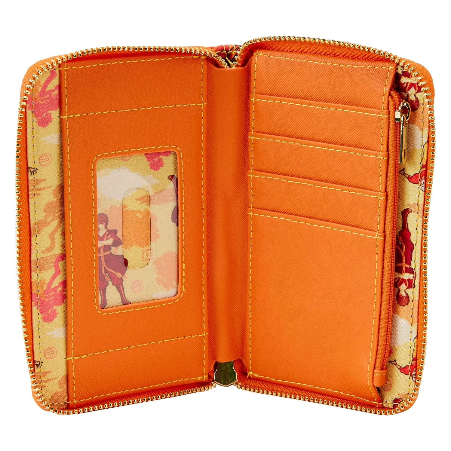 The Loungefly Avatar: The Last Airbender Fire Dance Zip Around Wallet is made of vegan leather (polyurethane). Wallet zips closed with sturdy metal hardware. Additional features include applique, foil, debossed, and printed details. Take note of the coordinating inside lining.