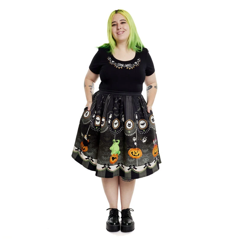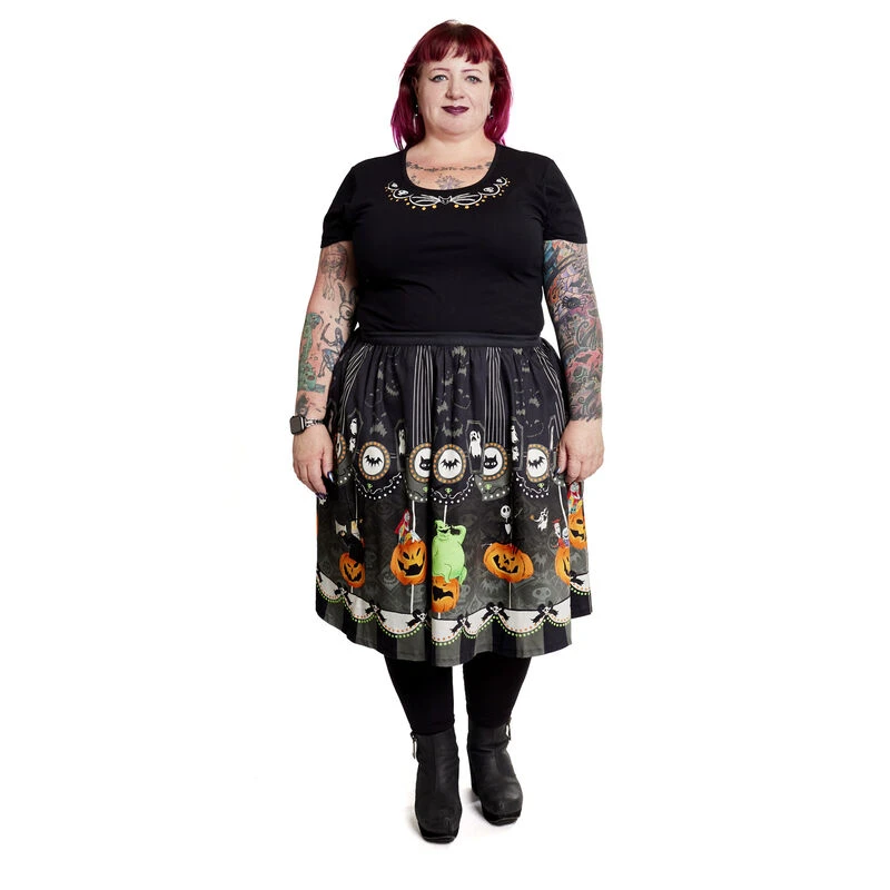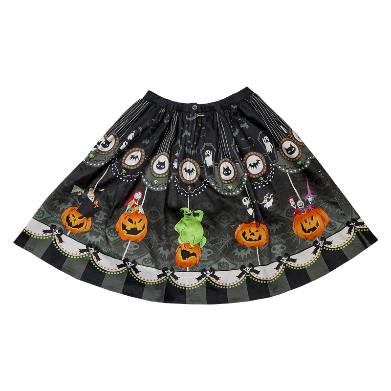 In our town of Halloween, haunt couture is always top of mind. Dress for the occasion with the Stitch Shoppe by Loungefly Nightmare Before Christmas “Sandy” Skirt. In this design, Jack Skellington and other residents from Halloween Town take a ride on a spooky carousel. Look closely and you’ll find the Mayor, Sally, Zero, Lock, Shock, Barrel, and Oogie Boogie as they bob up and down on carved jack-o’-lanterns. A thrilling motif of bats, black cats, and ghosts accompany the carousel above.